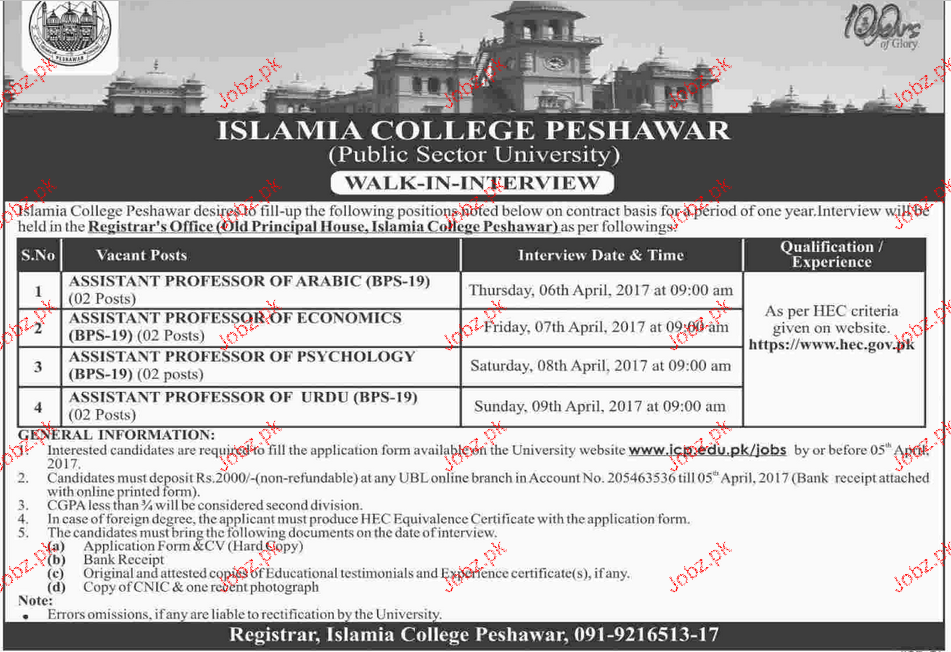 Apply as per details in job advertisement. Login to view further details of how to apply via https://www.jobz.pk online.