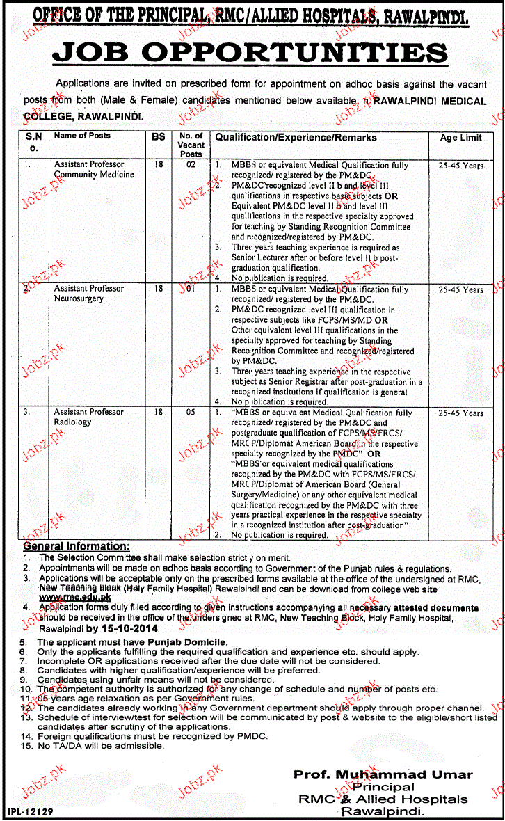 Assistant Professors Job In RMC & Allied Hospitals Rwp