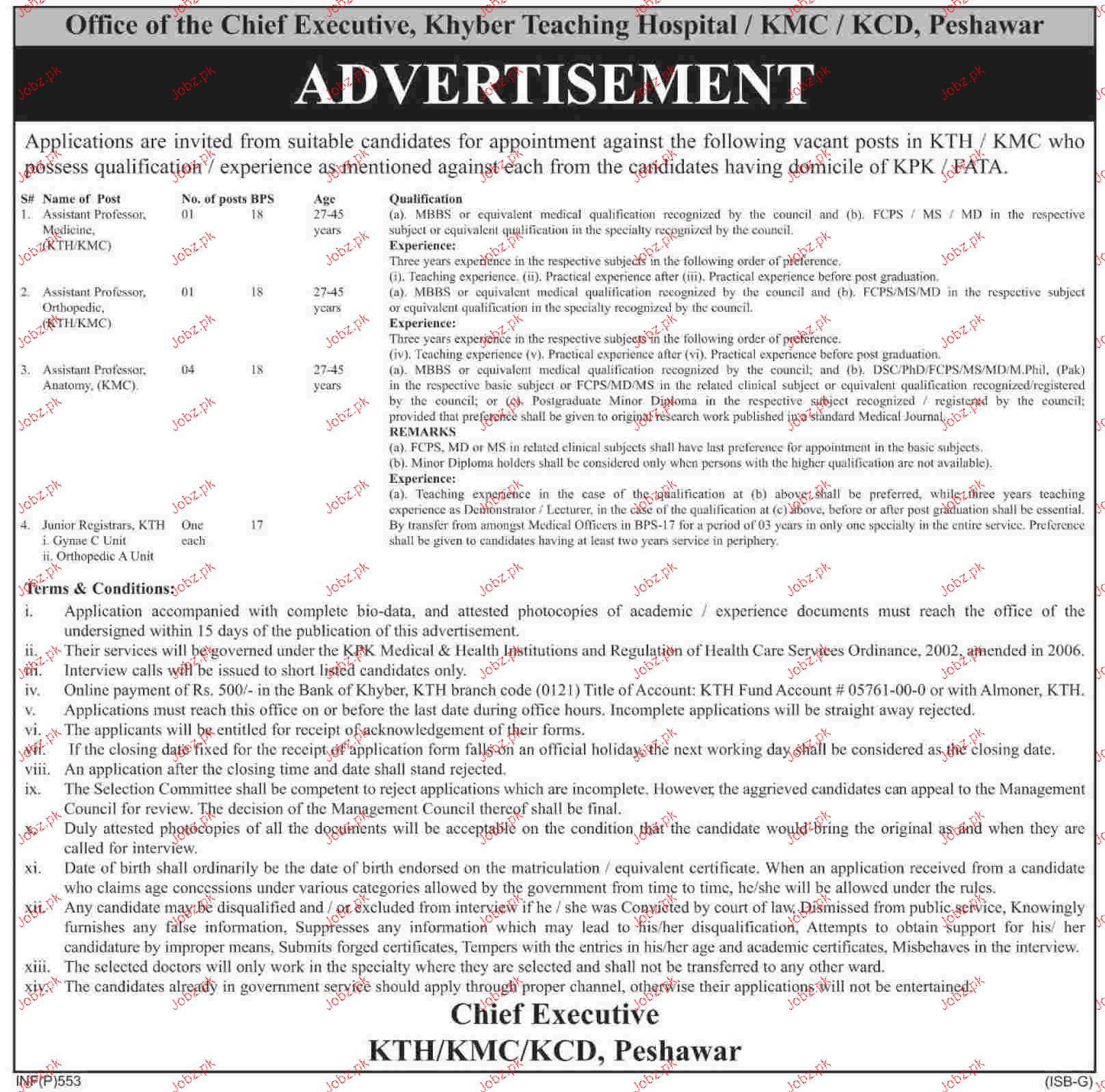Assistant Professors, Junior Registrar Job In Khyber Teachin