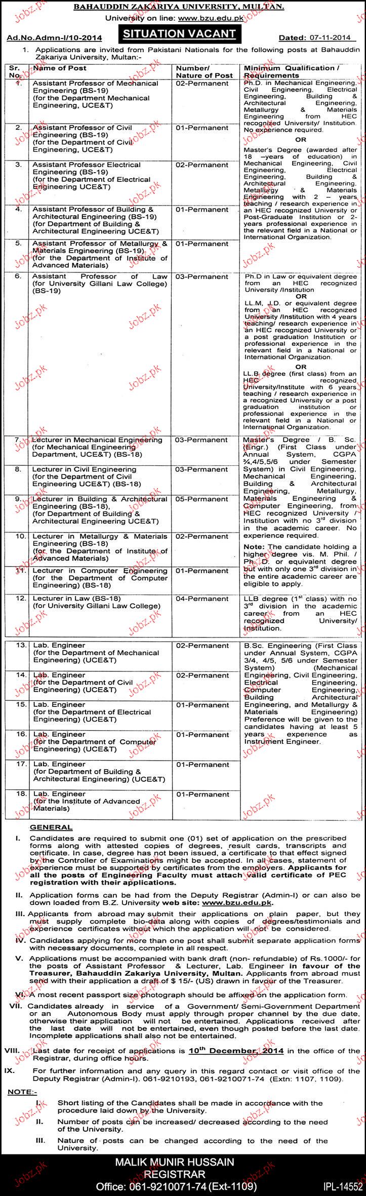 Assistant Professors, Lecturers And Lab Engineer Job In BZU