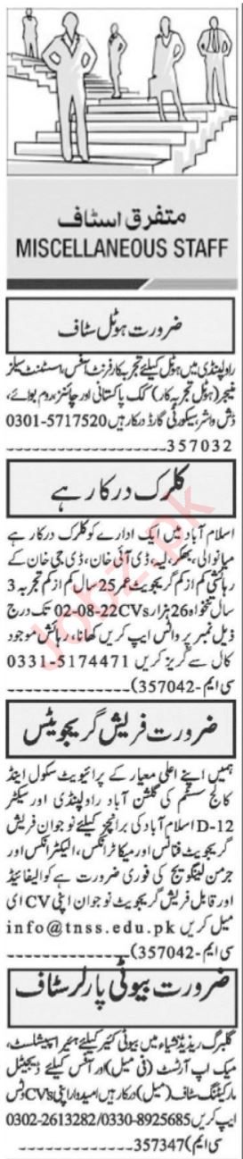 Private Company Islamabad, rawalpindi Islamabad Pakistan invites applications from eligible candidates for the post of german language teacher, engineer, cook, room boy, dishwasher, assistant sales manager, front desk officer, security guard, finance officer, clerk and finance manager as per advertisement of July 30, 2022 published in daily Jang Newspaper. Persons with Bachelor, Middle, Matric and Intermediate etc. education can apply.