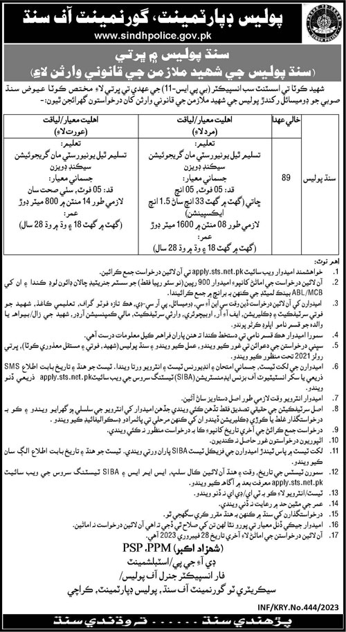 Assistant Sub Inspector jobs at Sindh Police Via STS
