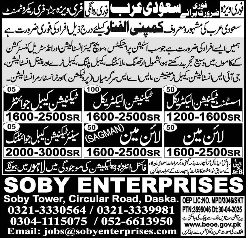 Soby Enterprises Overseas Employment Promoters Saudi Arabia, saudi arabia Saudi Arabia invites applications from eligible candidates for the post of lineman, sagman lineman, technician electrical, technician cable jointer and assistant technician electrician as per advertisement of May 5, 2025 published in daily Express Newspaper. Persons with DAE, Intermediate, Matric and Bachelor etc. education can apply.