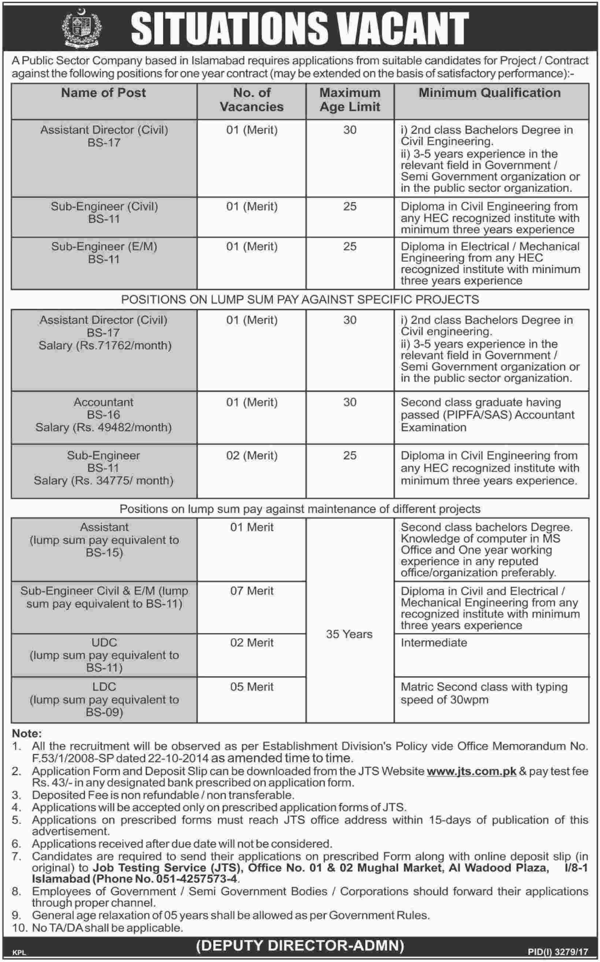 A Public Sector Company based in Islamabad requires applications from highly qualified and well educated individuals for the posts of Assistants, Sub Engineers, Accountant, UDC & LDC in Islamabad, Pakistan Via JTS Job Testing Service. The interested candidates contact and apply as per given criteria.