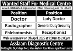 Asslaam Diagnostic Center is looking for candidates for following posts as per job advertisement published in daily Jang Newspaper of March 30, 2025 for location Allama Iqbal Town Lahore, lahore Punjab Pakistan: