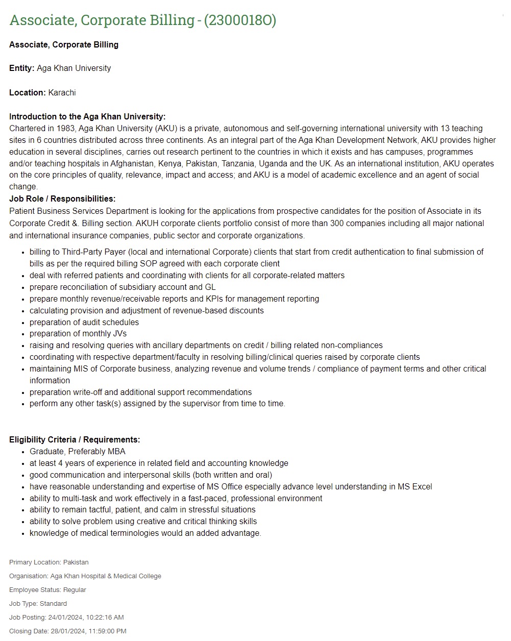 Vacant posts including associate corporate billing are announced in Aga Khan University Karachi, karachi Sindh Pakistan as per 25 January 2024 advertisement in daily Other Newspaper. Persons with Master and MBA etc. education can apply.