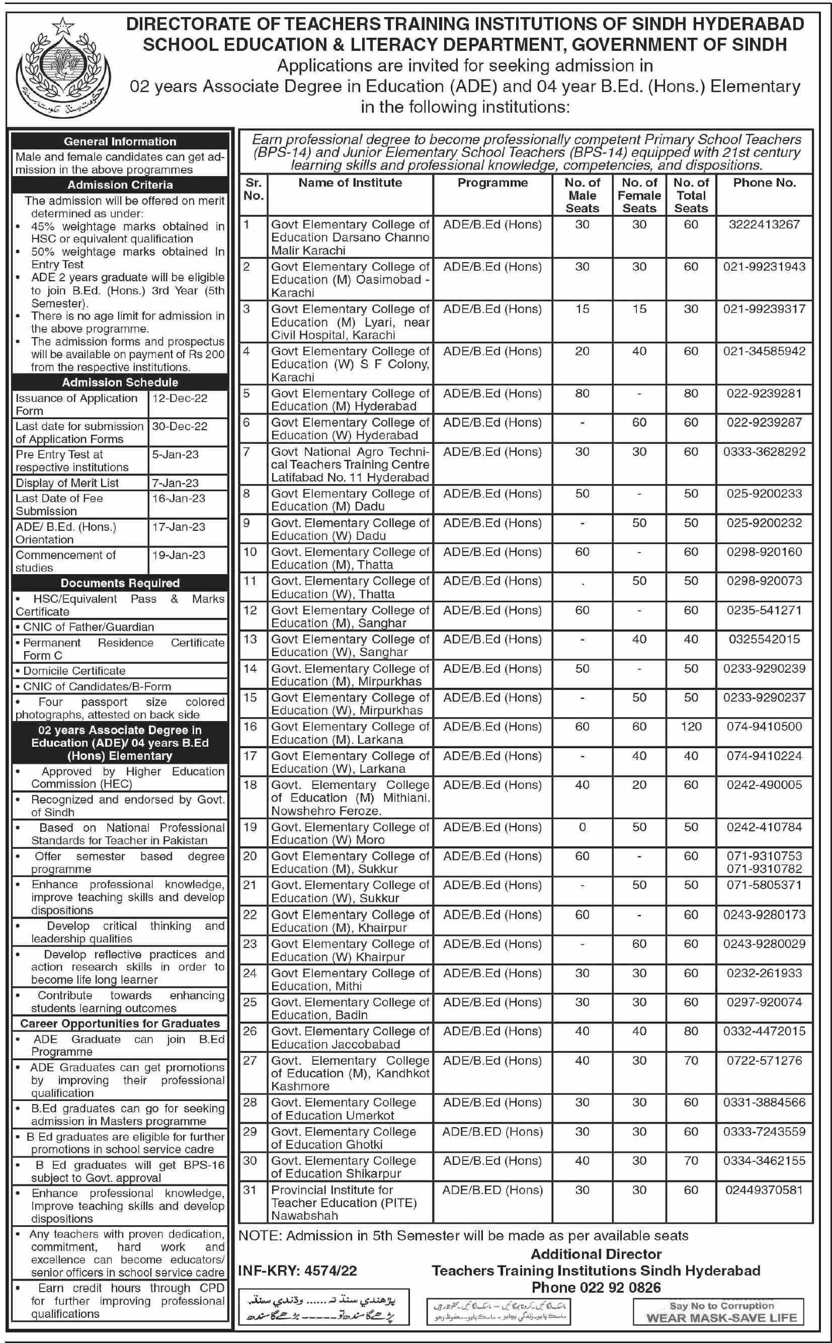 School Education & Literacy Department admissions 2022 for Associate Degree in Education ADE, B.Ed Bachelor of Edudcation has been announced. Students can enroll for admissions in School Education & Literacy Department Hyderabad Ghotki, Naushahro Feroze, Karachi, Dadu, Mithi, Thatta, Kandhkot, Badin, Kashmore, Umerkot, , Sukkur, Khairpur, Mirpur Khas, Sanghar, Nawabshah and Larkana Sindh Pakistan for academic year 2022 to continue campus based or online education in Management College. Students for admissions in B.ed and ADP can apply for online or campus classes as per Government institute criteria till admission closing date December 30, 2022. Read newspaper ad for exact details.