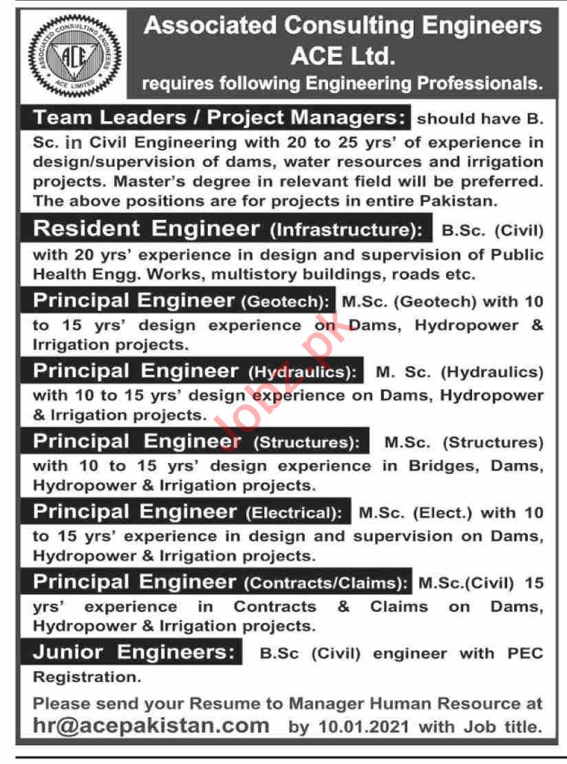 Associated Consulting Engineers ACE Private Limited Karachi, Pakistan is seeking for the services from experienced candidates for the posts of Team Leader, Project Manager, Resident Engineer, Engineer, Civil Engineer, Principal Engineer, Geotech Engineer, Hydraulics Engineer, Structures Engineer, Electrical Engineer, Contracts Engineer, Claims Engineer, Junior Engineer.