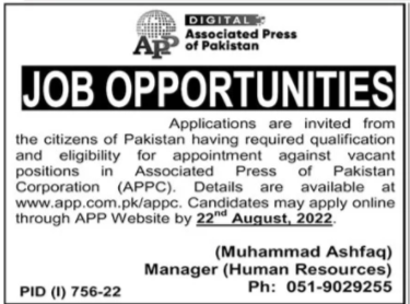 Vacancies in Associated Press of Pakistan Corporation Advertisement August 2022