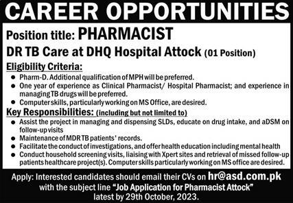DR TB Care, DHQ Hospital Attock, Association for Social Development ASD Attock, attock Punjab Pakistan invites applications from eligible candidates for the post of pharmacist as per advertisement of October 21, 2023 published in daily Express Newspaper. Educational qualifications required Pharma D etc.
