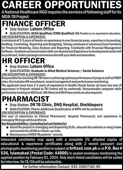 MDR TB Project, Vacant posts including finance officer, hr officer and pharmacist are announced in Association for Social Development ASD Lahore, sheikhupura Punjab Pakistan as per 24 January 2024 advertisement in daily Express Newspaper. Educational qualifications required ACCA, Pharma D, CA, Others and Bachelor etc.