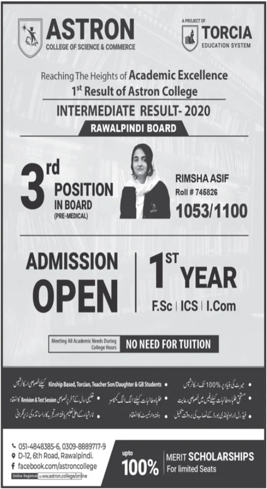ASTRON College of Science & Commerce, a well known Private Educational Institute in Rawalpindi is offering admissions in 1st Year for the programs of FSc, ICS and I.COM. Read newspaper ad for exact details.