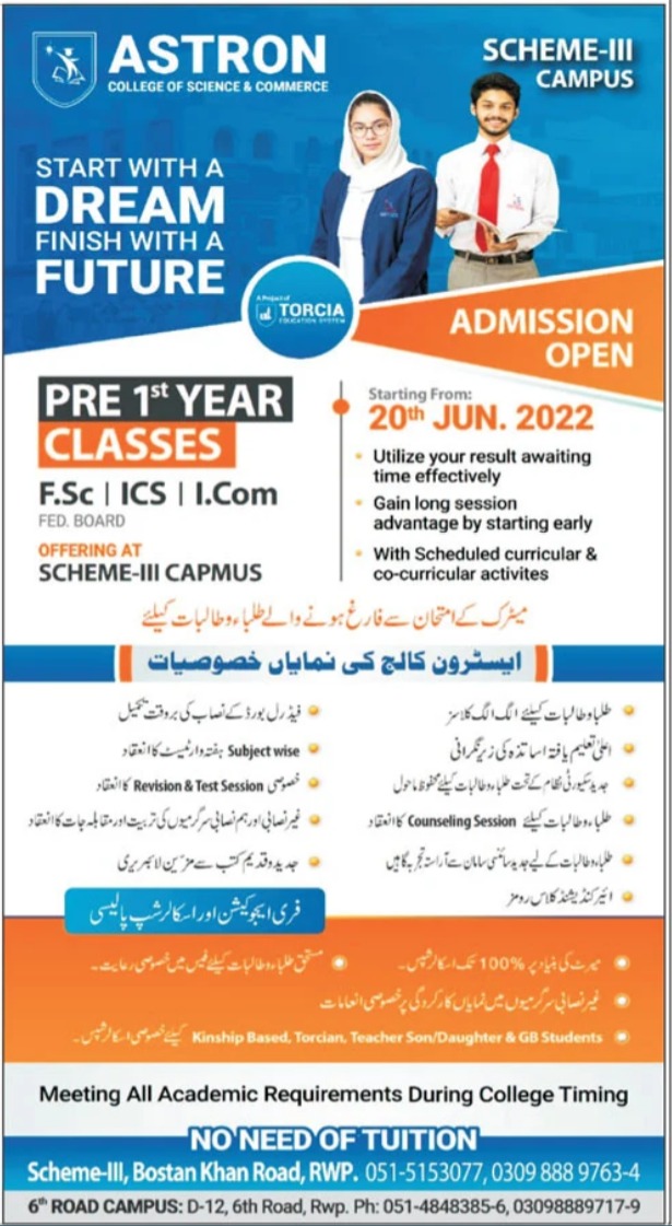 Astron College of Science & Commerce Pre 1st Year Class, Fsc Pre Medical, Fsc Pre Engineering, ICS, I.Com admissions 2022 has been started. Students can enroll for admissions in Astron College of Science & Commerce Rawalpindi Punjab Pakistan for academic year 2022 to continue campus based or online education in Science College. Eligible students for fulfilling criteria for admissions in Intermediate, ICS and I.com can enroll as per Private admission policy 2022 till closing date 20 June 2022. Read newspaper ad for exact details.