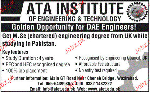 Ata Institute of Engineering & Technology Admission in MSc in Wazirabad. Read newspaper ad for exact details.