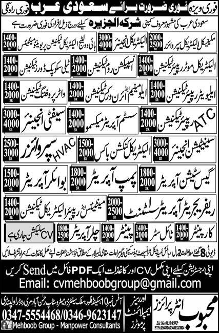 Mehboob Enterprises Overseas Employment Promoters Dammam, riyadh Saudi Arabia invites applications from eligible candidates for the post of hvac supervisor, carpenter, aluminum works technician, atc repair technician, painter, electrical connection box, iron works technician, electrical engineer, inspection room technician, maintenance technician, refrigerator operator assistant, chiller operator, electrical technician, tile fixer, sanitation engineer, waterproofing technician, gas station operator, high voltage electrician technician, safety engineer, pump operator, boiler operator, elevator repair technician, electrical motor repair technician, mechanical electrical supervisor, telescopic dozer technician and system operator as per advertisement of March 1, 2024 published in daily Express Newspaper. Matric, Bachelor, DAE, Intermediate, BA and B.E etc. educational qualification will be preferred.