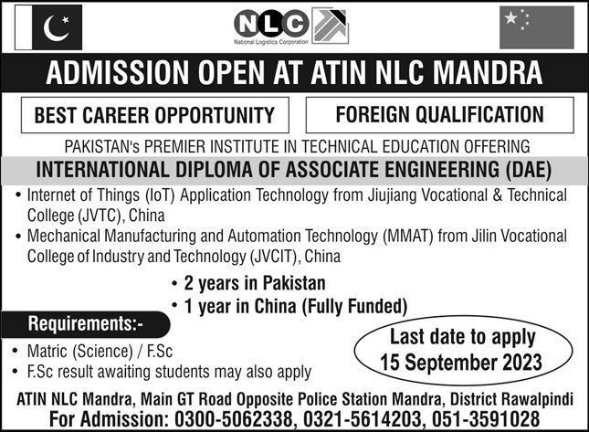 National Logistics Cell NLC has announced admissions 2023 for International Diploma of Associate Engineering DAE. Students who want to take admissions in National Logistics Cell NLC Gujar Khan Punjab Pakistan for academic year 2023 to continue education in Engineering Diploma can apply. Students for admissions in DAE can apply for online or campus classes as per Government institute criteria till admission closing date September 15, 2023. Read newspaper ad for exact details.