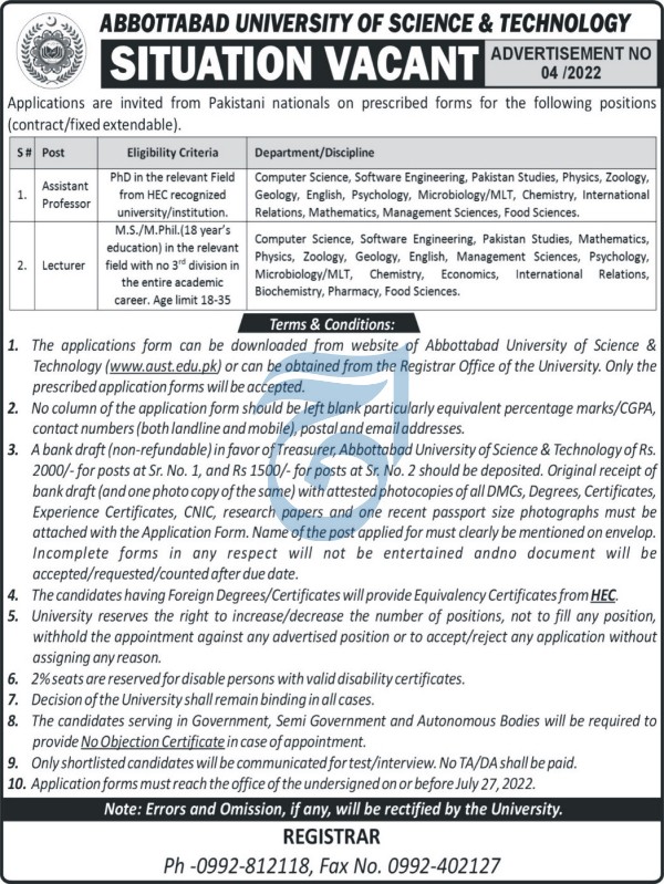 Vacant posts including assistant professor, lecturer, lecturer english, lecturer pharmacy, lecturer computer science, lecturer food sciences, lecturer pakistan studies, lecturer physics, lecturer economics, lecturer chemistry, lecturer psychology, lecturer microbiology, lecturer zoology, lecturer biochemistry, lecturer management sciences, lecturer software engineering, lecturer international relations, lecturer mathematics and lecturer geology are announced in Abbottabad University of Science and Technology Peshawar, peshawar Khyber Pakhtunkhwa KPK Pakistan as per 13 July 2022 advertisement in daily Aaj Newspaper. Preferred Education is Master, Phd, Mphil and MS etc.