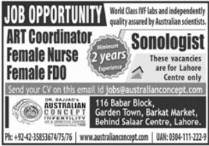 Australian Consept Infertility Medical Center jobs advertisement dated about 13 March 2022 in daily Jang Newspaper invites application for the vacant post of art coordinator, sonologist and nurse in Lahore, lahore Punjab Pakistan. Educational qualifications required Bachelor and Master etc.