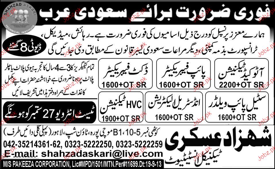 Auto Cad Technicians, Pipe Fabricators and Duct Fabricators are required in Saudi Arabia