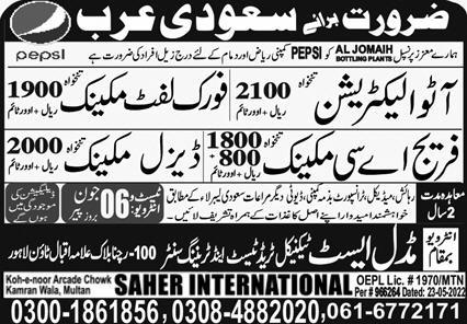 Vacant posts including mechanic, auto electrician, fork lift mechanic, diesel mechanic and fridge ac mechanic are announced in Saher International Dammam, dammam Saudi Arabia as per 3 June 2022 advertisement in daily Express Newspaper. Candidates with Intermediate and Matric etc. educational background will be preferred.