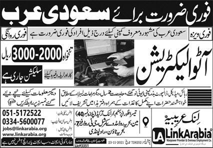 Link Arabia Overseas Recruitment Company jobs advertisement dated about 30 January 2022 in daily Express Newspaper invites application for the vacant post of auto electrician in Saudi Arabia Saudi Arabia. Preferred Education is Intermediate and Matric etc.