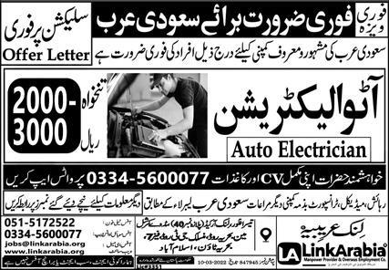 Link Arabia Overseas Recruitment Company jobs advertisement dated about 4 April 2022 in daily Express Newspaper invites application for the vacant post of auto electrician in Dammam, dammam Saudi Arabia. Preferred Education is Intermediate and Matric etc.