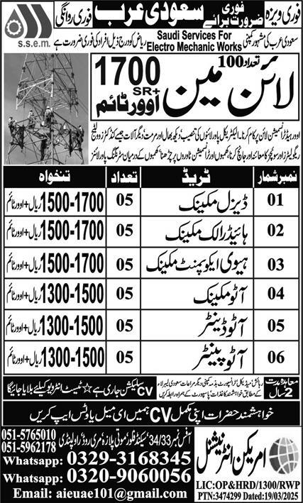 American International Overseas Employment Promoter OEP jobs advertisement dated about 26 March 2025 in daily Express Newspaper invites application for the vacant post of hydraulic mechanic, auto painter, lineman, heavy equipment mechanic, auto denter, diesel mechanic and auto mechanic in Dammam, al khobar Saudi Arabia. Preferred Education is Matric, DAE, Bachelor and Intermediate etc.