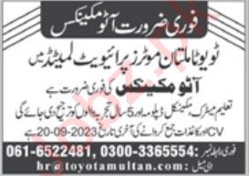 Vacant posts including auto mechanic are announced in Toyota Multan Motors Multan, multan Punjab Pakistan as per 10 September 2023 advertisement in daily Khabrain Newspaper. Candidates with DAE and Matric etc. educational background will be preferred.