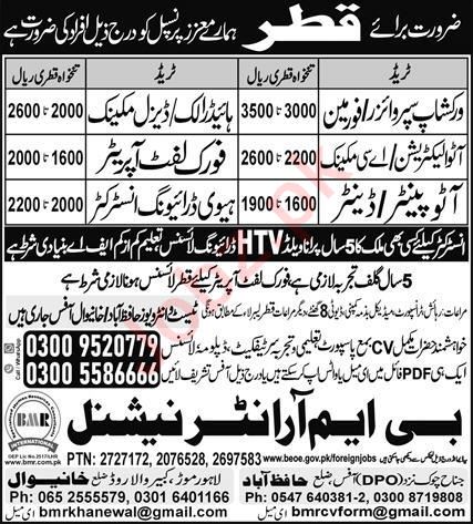BMR International jobs advertisement dated about 28 July 2024 in daily Express Newspaper invites application for the vacant post of auto painter, workshop supervisor, denter, auto electrician, ac mechanic and foreman in Qatar, qatar Qatar. Educational qualifications required Middle, Primary and Matric etc.
