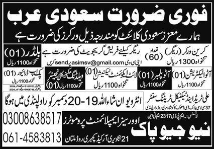 Ali Trade Test & Training Center is looking for candidates for following posts as per job advertisement published in daily Express Newspaper of December 13, 2024 for location Dammam, jeddah Saudi Arabia: