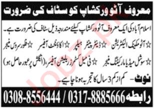 Auto Workshop Islamabad, islamabad Islamabad Pakistan invites applications from eligible candidates for the post of female customer relations officer, denter painter helper, denter, social media marketing manager, painter, floor service manager, accounts officer and auto mechanic electrician as per advertisement of December 25, 2022 published in daily Jang Newspaper. Intermediate, Middle, Matric and Bachelor etc. educational qualification will be preferred.