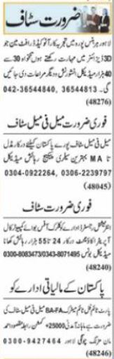Private Company Lahore, lahore Punjab Pakistan invites applications from eligible candidates for the post of clerk, accountant, office staff, 3d designer, computer call operator, autocad draftsman, office boy and finance officer as per advertisement of August 26, 2022 published in daily Nawaiwaqt Newspaper. Matric, Intermediate, Middle and Bachelor etc. educational qualification will be preferred.