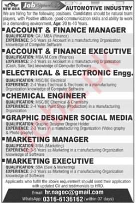 Vacant posts including account finance manager, chemical engineer, marketing executive, electrical engineer, graphic designer social media, electronic engineer, account finance executive and marketing manager are announced in Automotive Industry Lahore, lahore Punjab Pakistan as per 26 February 2024 advertisement in daily Jang Newspaper. MS, Master, Intermediate, Bachelor and Matric etc. educational qualification will be preferred.