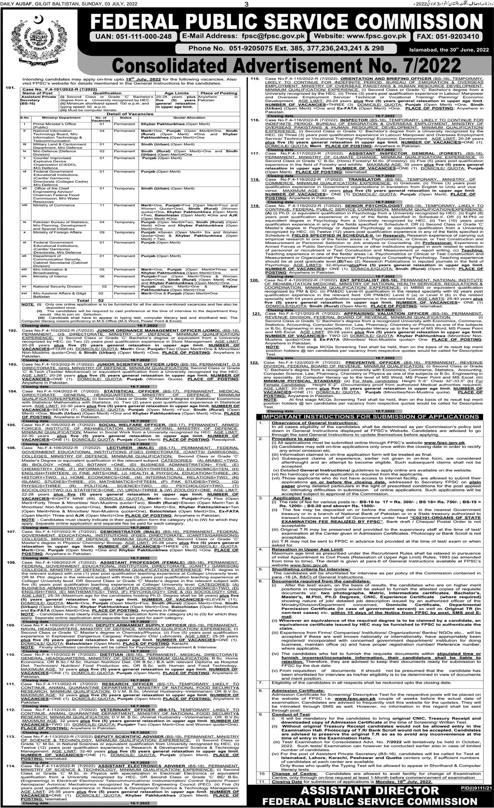 Federal Public Service Commission FPSC jobs advertisement dated about 3 July 2022 in daily Ausaf Newspaper invites application for the vacant post of inspector, assistant private secretary, assistant inspector general forest, deputy armament supply officer, statistical officer, ordnance management officer, lecturer, deputy scientific advisor, research officer, assistant electronic advisor, orientation briefing officer, appraising valuation officer, female assistant professor, ent specialist, psychologist, dietitian, preventive officer, scientific officer, veterinary officer, demontrator and social welfare officer in Islamabad, islamabad Islamabad Pakistan. Phd, MBBS, M.sc, B.E, Master and Bachelor etc. educational qualification will be preferred.