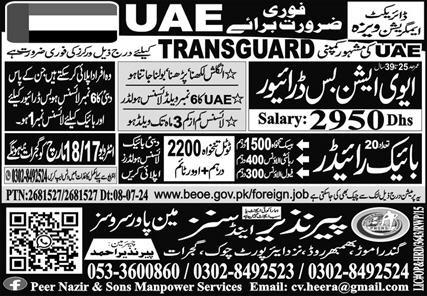 Peer Nazeer & Sons Manpower Services invites applications for job positions advertised in daily Express dated 14 March 2025 for following vacancies in Abu Dhabi, sharjah UAE.