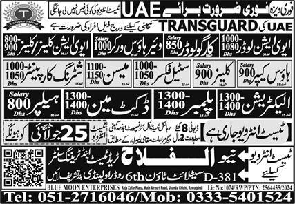Blue Moon Enterprises Abu Dhabi, abu dhabi UAE invites applications from eligible candidates for the post of aviation loader, duct man, mason, aviation cleaner, cargo loader, plumber, helper, cleaner, shuttering carpenter, electrician, house keeper, warehouse worker and steel fixer as per advertisement of July 23, 2024 published in daily Express Newspaper. Candidates with Intermediate, Matric and Middle etc. educational background will be preferred.