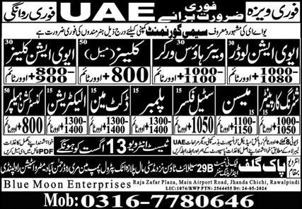 Blue Moon Enterprises jobs advertisement dated about 10 August 2024 in daily Express Newspaper invites application for the vacant post of shuttering carpenter, construction helper, electrician, aviation cleaner, cleaner, mason, warehouse worker, duct man, plumber, steel fixer and aviation loader in Abu Dhabi, sharjah UAE. Persons with Intermediate and Matric etc. education can apply.