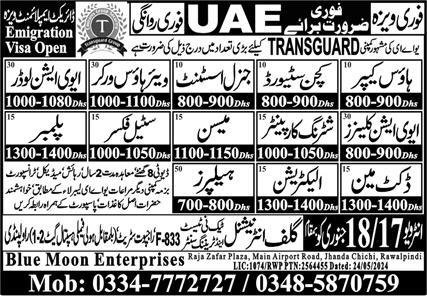 Vacant posts including electrician, plumber, shuttering carpenter, house keeper, steel fixer, mason, general assistant, aviation loader, helper, duct man, aviation cleaner, warehouse worker and kitchen steward are announced in Blue Moon Enterprises Abu Dhabi, sharjah UAE as per 16 January 2025 advertisement in daily Express Newspaper. Persons with Middle, Intermediate and Matric etc. education can apply.