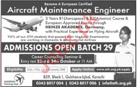 Aviation Training Hub is offering admissions in Aircraft Maintenance Engineering with European Approved Exams Through Heinze Akademie, Germany. Apply online via their website www.ath.org.pk/apply Read newspaper ad for exact details.