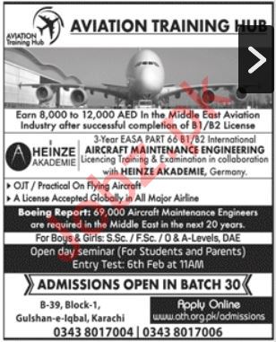 Aviation Training Hub Karachi, Pakistan are announcing admissions Batch 30 spring 2020 for the classes of Professional Diploma in Aircraft Maintenance Engineering. Read newspaper ad for exact details.