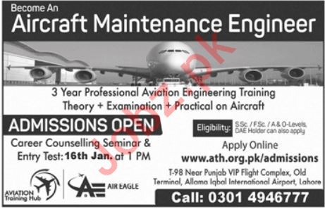Aviation Training Hub is an Aviation Training Institute has announced admissions for 3 Years Professional Aviation Engineering Training in Lahore Punjab Pakistan. Read newspaper ad for exact details.