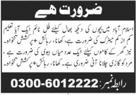 Vacant posts including aya and driver are announced in House Islamabad, islamabad Islamabad Pakistan as per 31 January 2024 advertisement in daily Jang Newspaper. Candidates with Middle and Matric etc. educational background will be preferred.