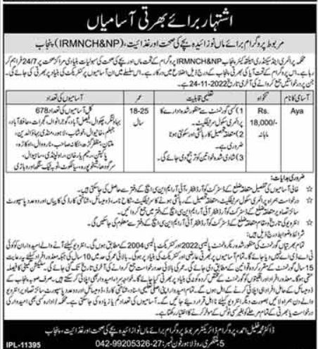 Primary & Secondary Healthcare Department jobs advertisement dated about 9 November 2022 in daily Dunya Newspaper invites application for the vacant post of aya in Faisalabad, bahawalnagar, nankana sahib, sheikhupura, pakpattan, mandi bahauddin, lahore, chakwal, gujranwala, vehari, narowal, sialkot, toba tek singh, multan, gujrat, sahiwal, hafizabad, khanewal, sargodha, faisalabad, muzaffargarh, khushab, rahim yar khan, okara, jhelum and rawalpindi Punjab Pakistan. Candidates with Primary etc. educational background will be preferred.