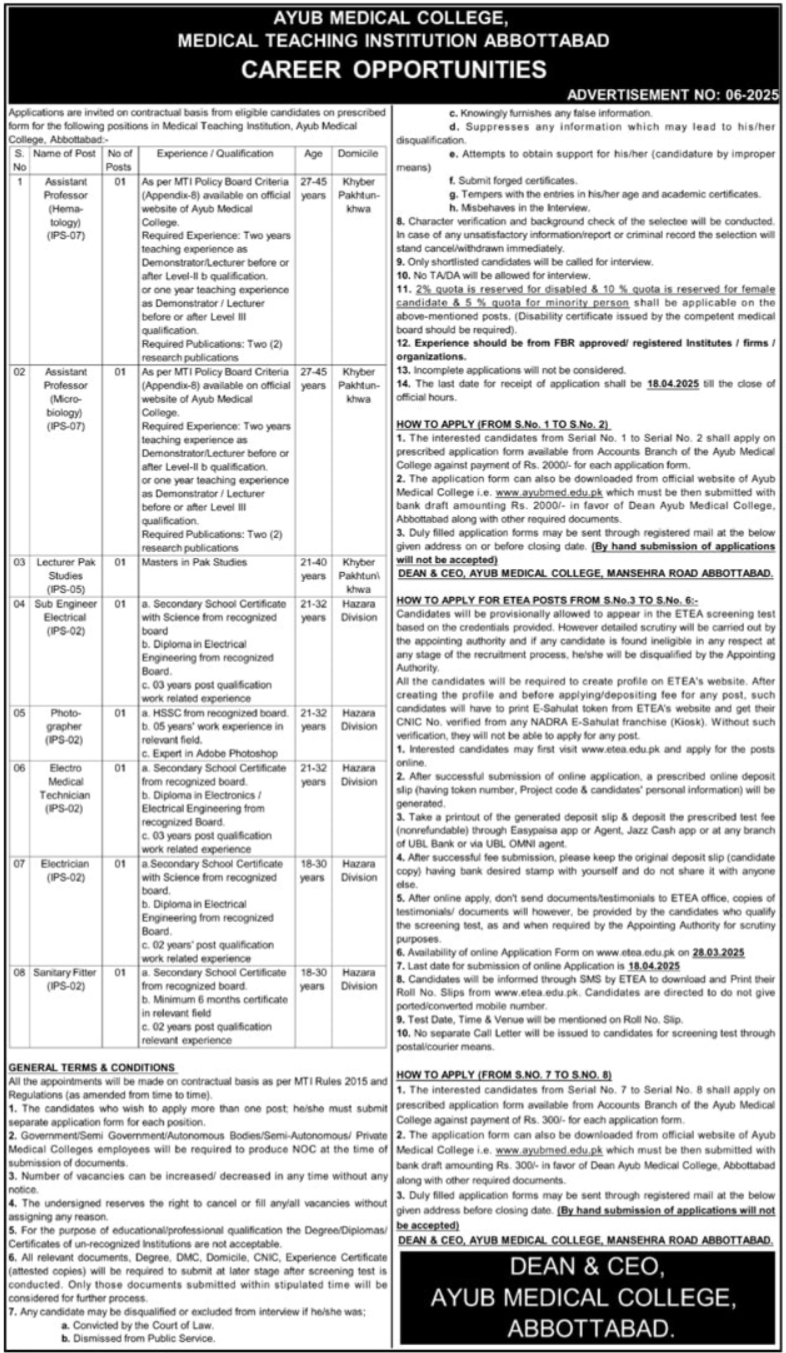 Medical Teaching Institution MTI, Ayub Medical College Main Mansehra Road Abbottabad, abbottabad Khyber Pakhtunkhwa KPK Pakistan invites applications from eligible candidates for the post of assistant professor hematology, electro medical technician, assistant professor, photographer, sanitary fitter, lecturer, lecturer pak studies, sub engineer electrical, assistant professor microbiology and electrician as per advertisement of March 31, 2025 published in daily Mashriq Newspaper. Preferred Education is Intermediate, Phd, Matric, DAE, Mphil, Master and MS etc.