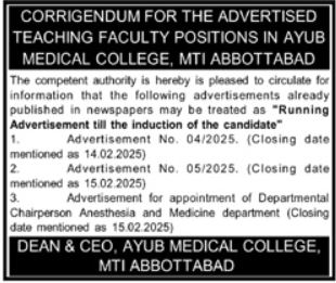 Ayub Medical College latest Government Education jobs and others can be applied till March 3, 2025 or as per closing date in newspaper ad. Read complete ad online to know how to apply on latest Ayub Medical College job opportunities.
