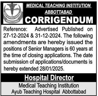 Ayub Teaching Hospital ATH, Medical Teaching Institution MTI is looking for candidates for following posts as per job advertisement published in daily Aaj Newspaper of January 18, 2025 for location Abbottabad, abbottabad Khyber Pakhtunkhwa KPK Pakistan: