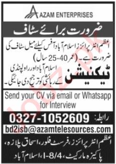 Vacant posts including technician are announced in Azam Enterprises Islamabad, islamabad Islamabad Pakistan as per 5 May 2024 advertisement in daily Jang Newspaper. Candidates with Matric and Intermediate etc. educational background will be preferred.
