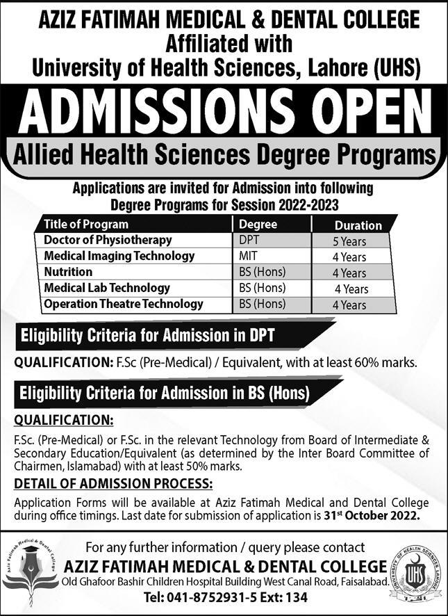 Aziz Fatimah Medical & Dental College Short Courses in Doctor of Physiotherapy DPT, Medical Imaging Technology MIT, Nutrition, Medical Lab Technology MLT, Operation Theatre Technology OTT. admissions 2022 has been announced. Aziz Fatimah Medical & Dental College Faisalabad Punjab Pakistan welcomes students to apply for admissions in academic year 2022 in Medical Course. Students for admissions in Course & criteria can apply as per Private institute admission policy 2022 before closing date October 31, 2022 as per advertisement. Read newspaper ad for exact details.