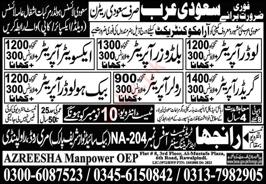 Azreesha Manpower Riyadh, riyadh Saudi Arabia invites applications from eligible candidates for the post of grader operator, loader operator, buildozer operator, excavator operator, back holder operator and roller operator as per advertisement of November 6, 2023 published in daily Express Newspaper. Candidates with Primary, Matric and Middle etc. educational background will be preferred.