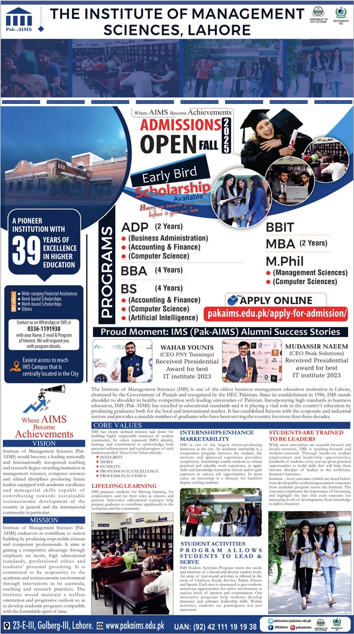 The Institute of Management Sciences PAK AIMS admissions 2025 for bs has been announced. Students who want to take admissions in The Institute of Management Sciences PAK AIMS Karachi Sindh Pakistan for academic year 2025 to continue education in Science University can apply. Students who want to enroll for academic session 2025 in qualification and admission criteria for Government institute can apply till last date. Read newspaper ad for exact details.